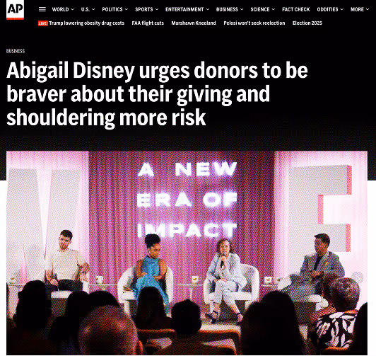 At the 2025 Make Good Famous Summit, Abigail Disney urged donors to be braver about their giving and shouldering more risk, capturing the attention of the media, including the Associated Press.