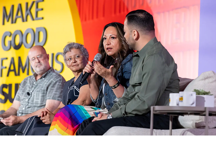 At the 2024 Make Good Famous Summit, 2023 Elevate Prize winner Crystal Echo Hawk speaks on stage alongside Brendan Vaughan, Editor-in-Chief, Fast Company; Cecilia Conrad, CEO, Lever for Change; and Edgar Villanueva, CEO, Decolonizing Wealth Project.