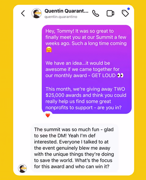 But it doesn’t end there. We have turned this thinking into an actual grant making strategy. Enter the Elevate Prize GET LOUD Award. This award meets people where they are: on Instagram. Each month, as audiences scroll through their feeds, we invite them to nominate a community-based organization they love to receive $25,000 in unrestricted funding.